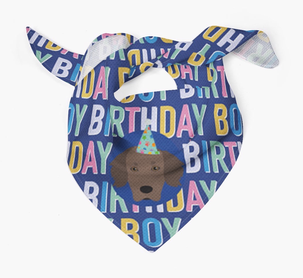 Featuring a colorful text pattern that reads 'birthay boy' and personalized with Cockador's cute icon (complete with a fun party hat), your Cockador will look simply pawgeous on their special day when they're wearing this bandana.
