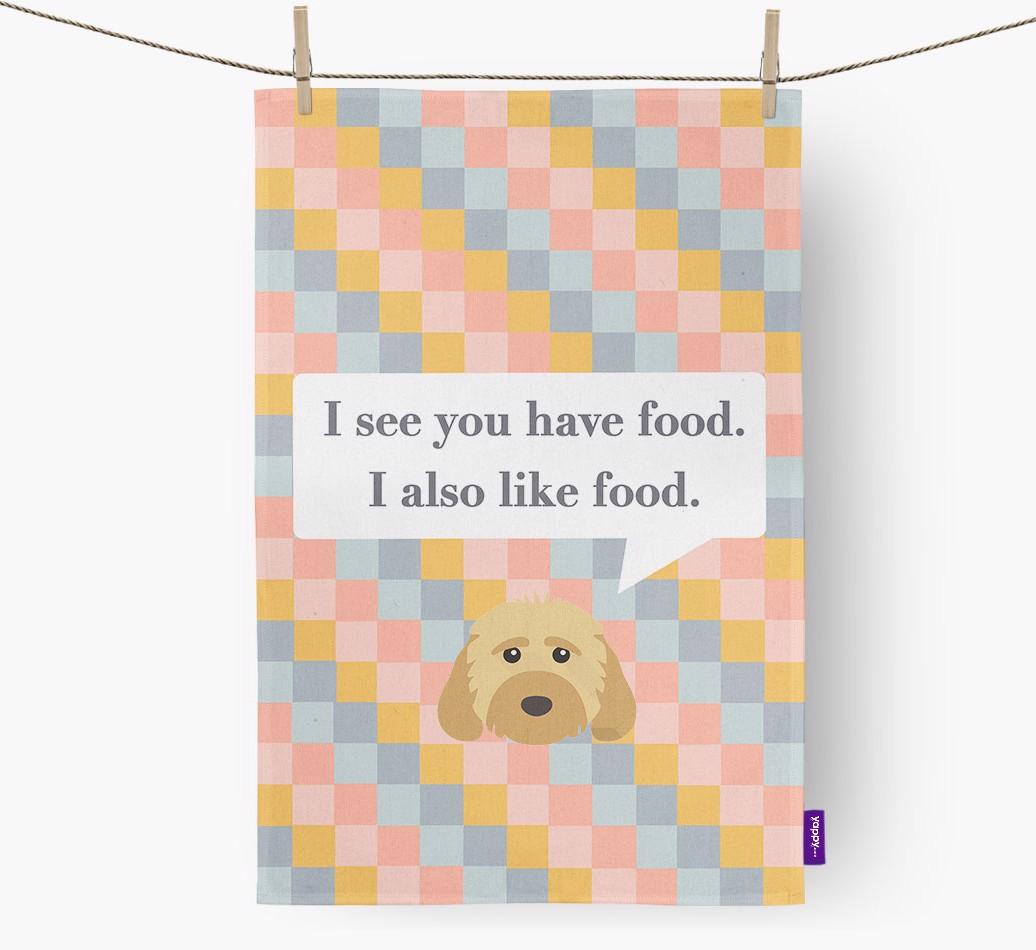 If your Cockapoo is a full time snack machine, this dish towel may be the ideal way to warn your guests.