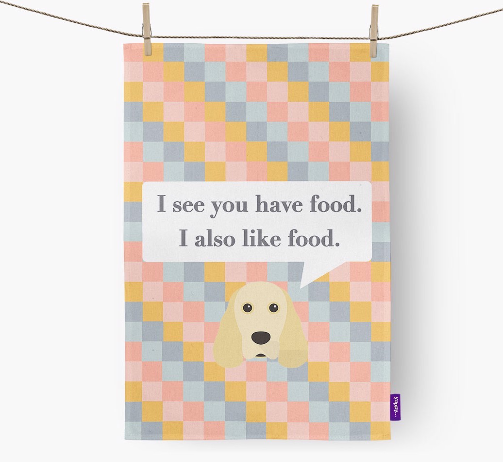 If your Cocker Spaniel is a full time snack machine, this dish towel may be the ideal way to warn your guests.