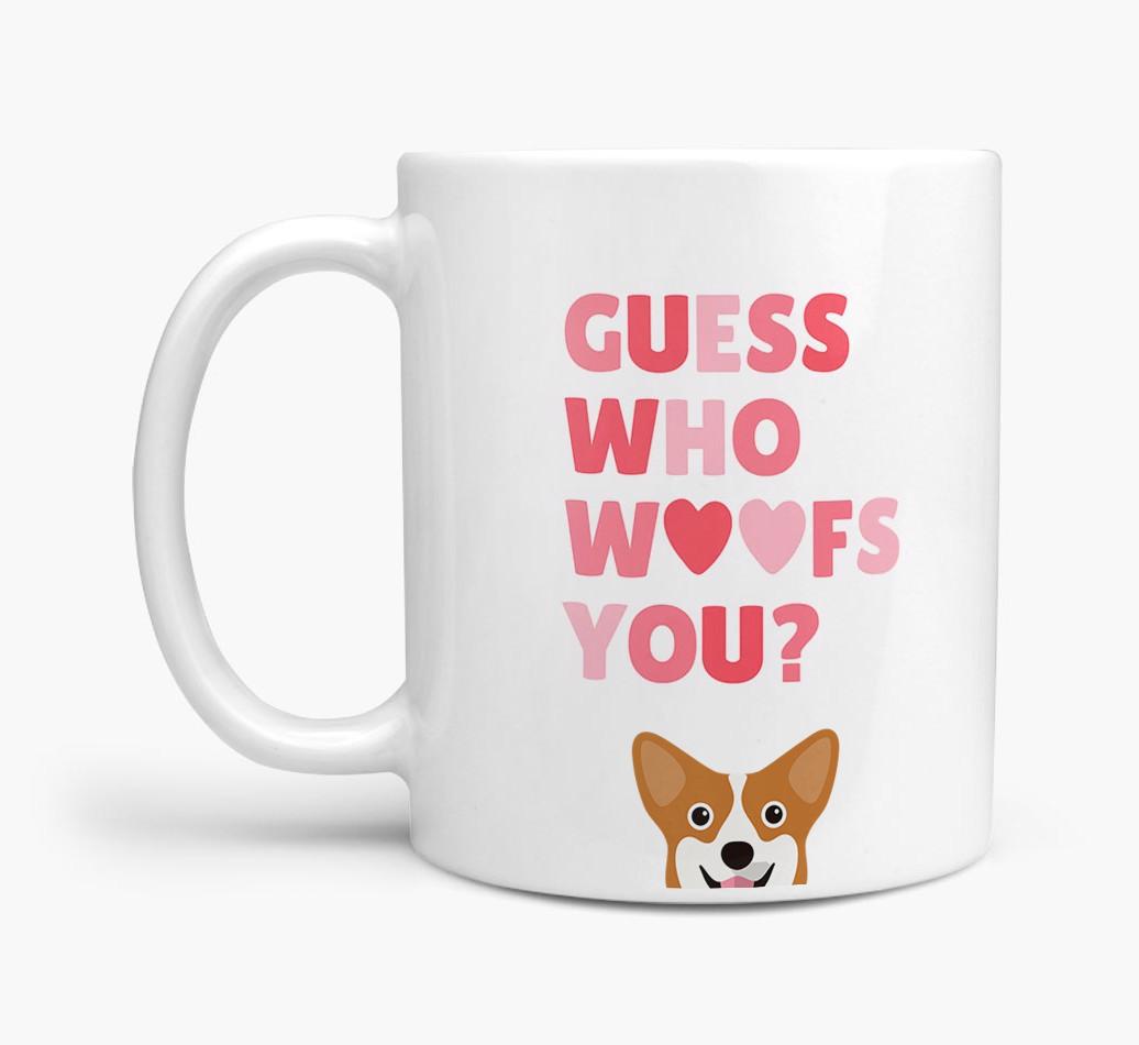 Personalized with Corgi's cute face, this adorable mug is perfect for showing off the one who "woofs" you - how sweet!