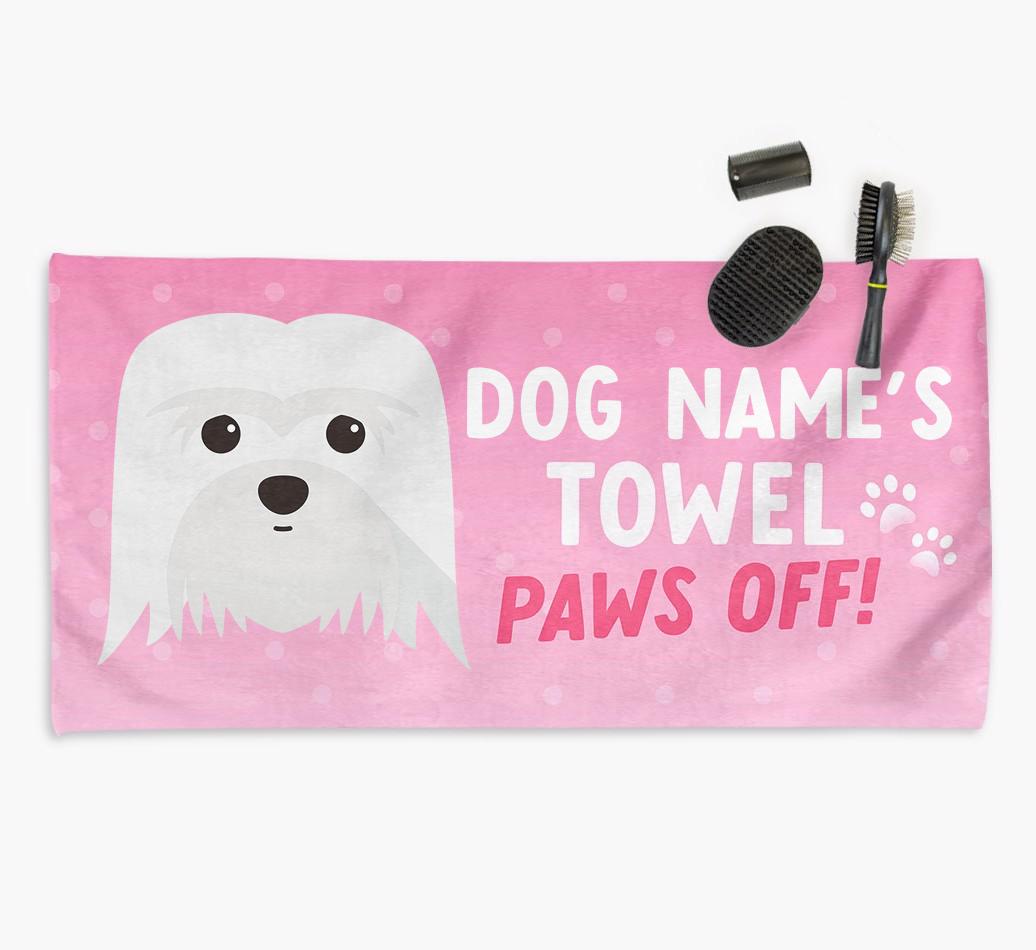 Perfect for messy pups and for pampering your Coton at bathtime, this soft and absorbent towel is made for cleaning your mucky pup and drying them off in a flash. It's personalized with Coton De Tulear's name and icon and is printed with a message for everyone else to keep their paws off it!