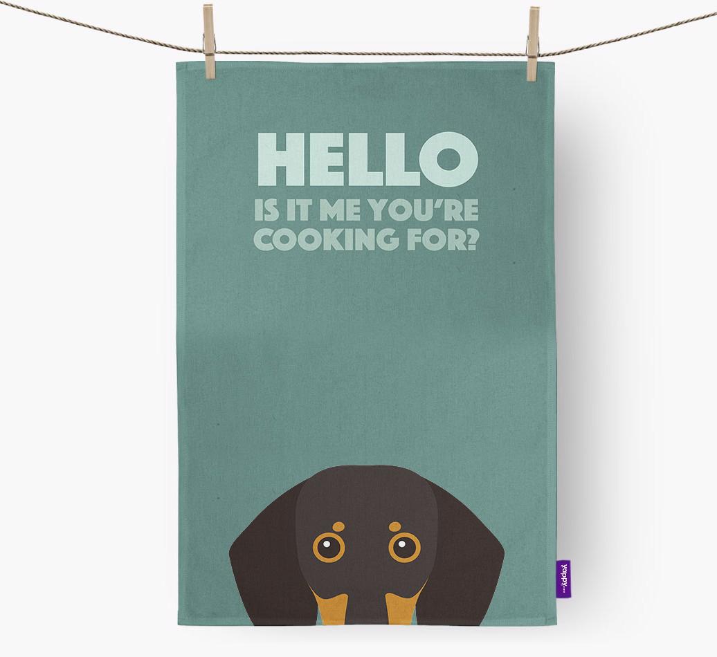 This gorgeous dish towel is sure to delight every Dachshund pawrent, especially as it stars their pup asking their favorite question, 'is it me you're cooking for?'