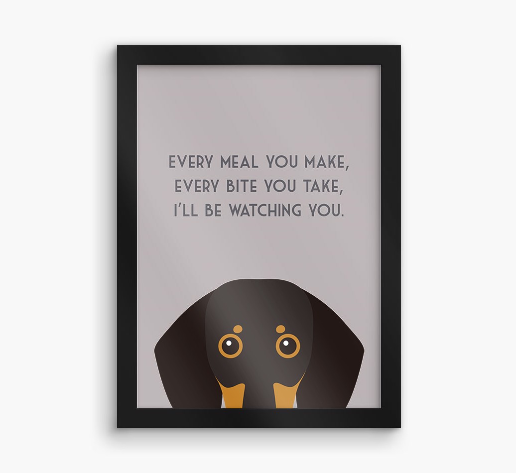 Printed with the words, ‘Every meal you make, every bite you take, I’ll be watching you’ and complete with our cute Dachshund peeking from the bottom of the design, this artwork will look great on display in the kitchen or anywhere Dachshund likes to watch you eat!