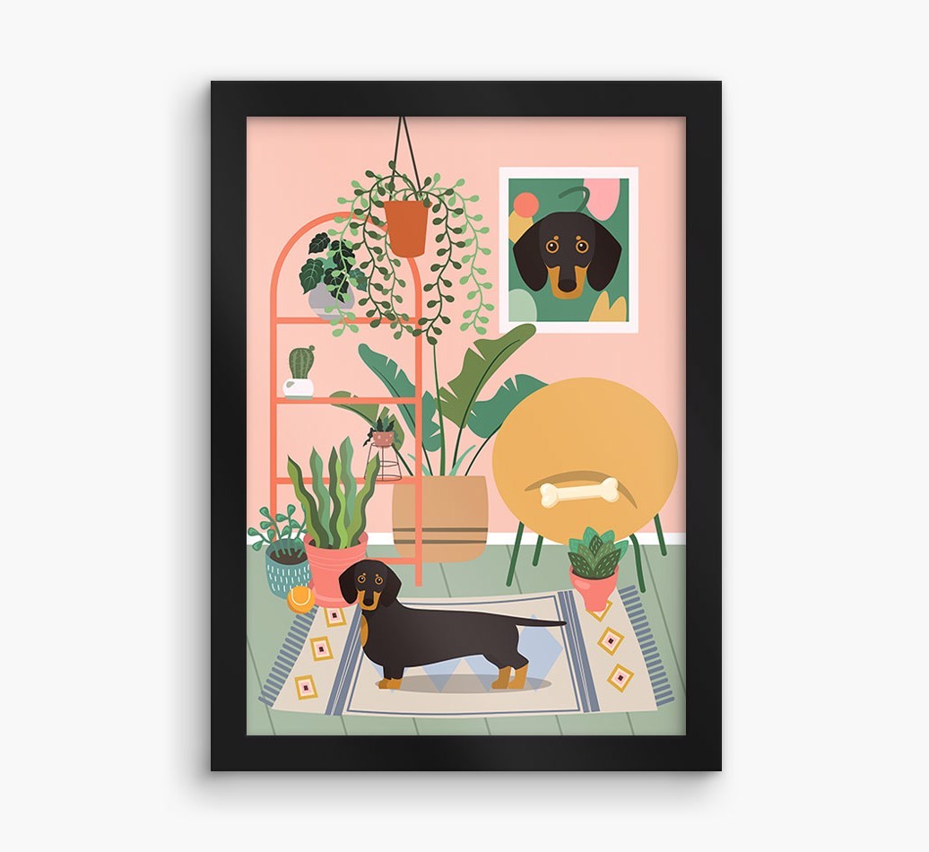 This contemporary piece of wall art pairs a chic living space with lovely pastel tones and a jungle of houseplants. Complete with the one that makes your house a home - Dachshund! - this print is a wonderful way to display your love for your pooch.