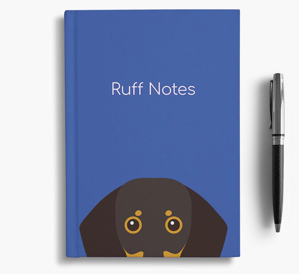 The front cover features our exclusive Dachshund peeking icon and is printed with the words, ‘Ruff Notes’, whilst the back is printed with the words ‘Live. Laugh. Woof.’.