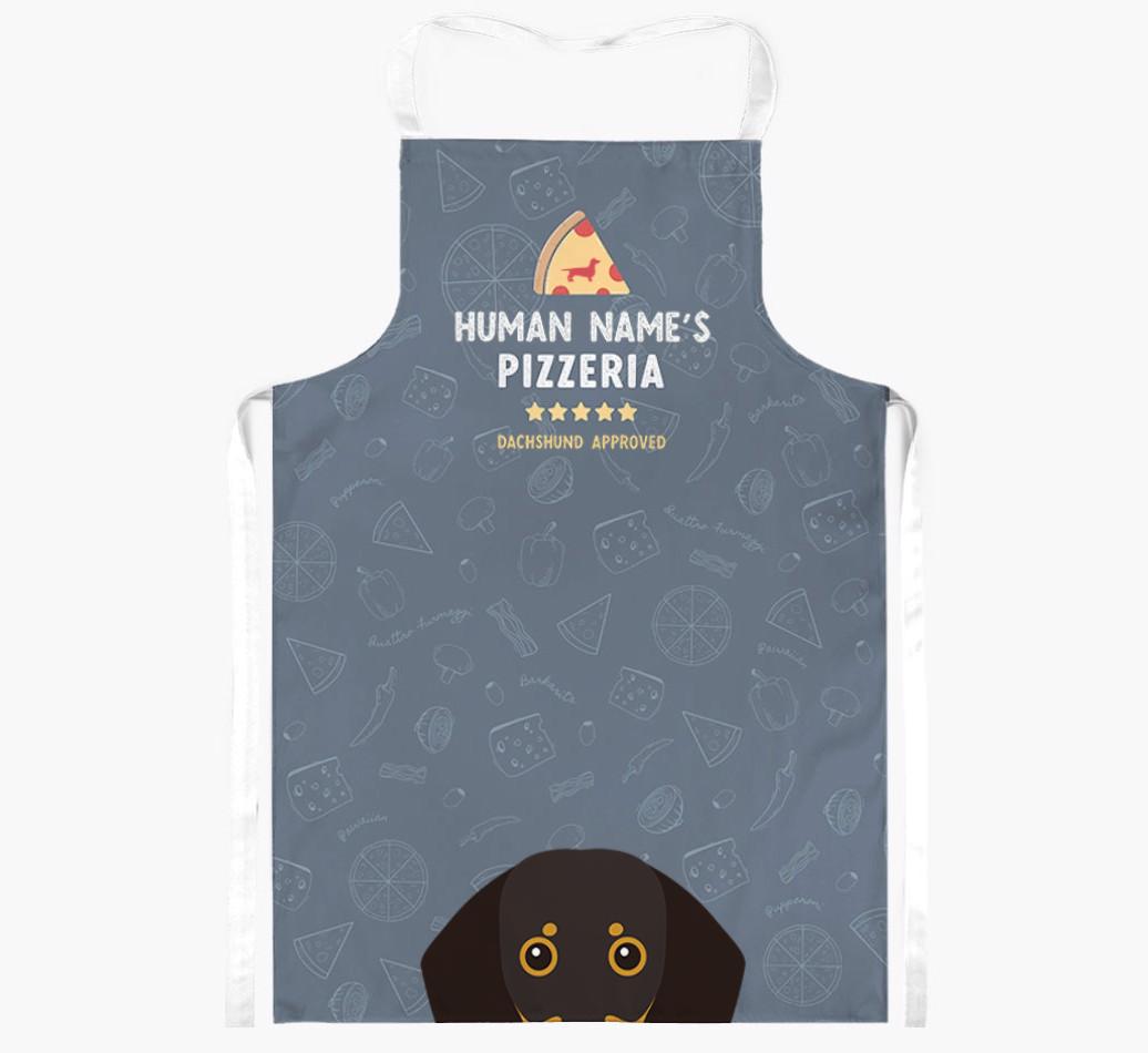 Featuring your furry friend's icon and lick of approval, plus your chosen human name, this apron is pawfect for anyone who considers themselves a pizza maestro in the kitchen. Available in a choice of 5 rustic colors, it'll make any Dachshund lover happy.