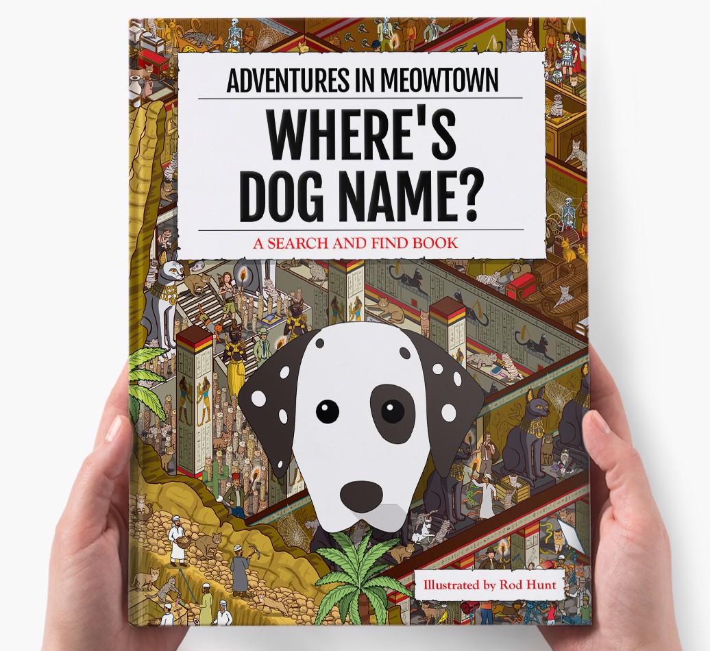 Get ready to unleash your inner detective with our popular Search & Find book, ‘Where’s (insert dog name)?’ It’s the personalized dog book everyone’s yapping about! With twelve beautifully illustrated locations to explore, we challenge you to find your adventurous {breedShortName} on each action-packed page. Can you spot all the canine cameos and funny parodies too?