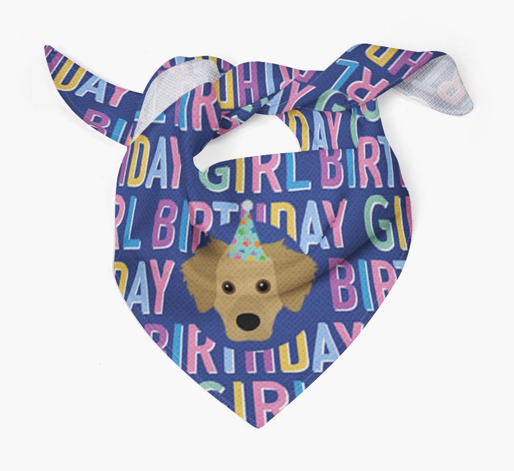 Featuring a text pattern that reads 'birthay girl' and personalized with Dameranian's cute icon (complete with a fun party hat), your Dameranian will look simply pawgeous on their special day when they're wearing this bandana.