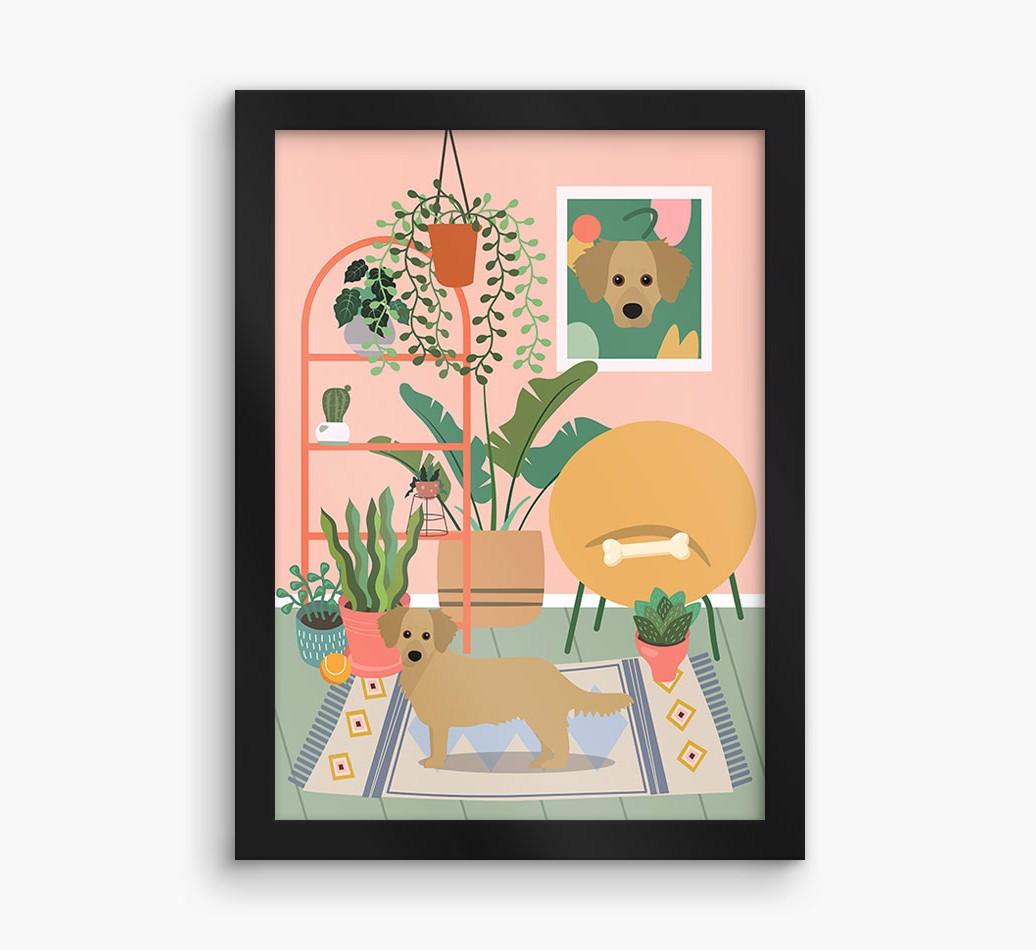 This contemporary piece of wall art pairs a chic living space with lovely pastel tones and a jungle of houseplants. Complete with the one that makes your house a home - Dameranian! - this print is a wonderful way to display your love for your pooch.