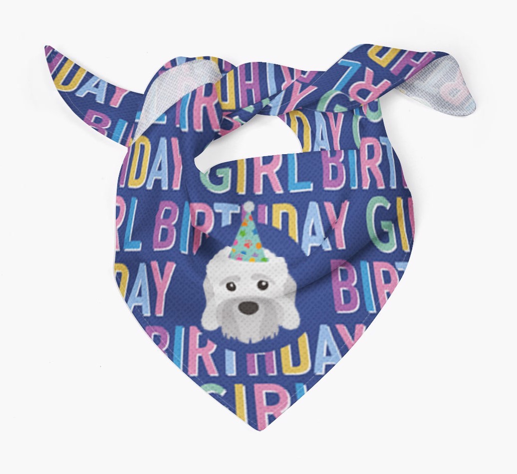 Featuring a text pattern that reads 'birthay girl' and personalized with Dandie Dinmont Terrier's cute icon (complete with a fun party hat), your Dandie will look simply pawgeous on their special day when they're wearing this bandana.