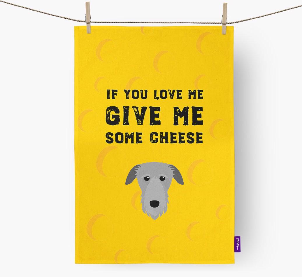 This exclusive Yappy dish towel features a pawsome Deerhound icon upon a cheese themed background and Deerhound's furvorite phrase ‘If you love me, give me some cheese’.