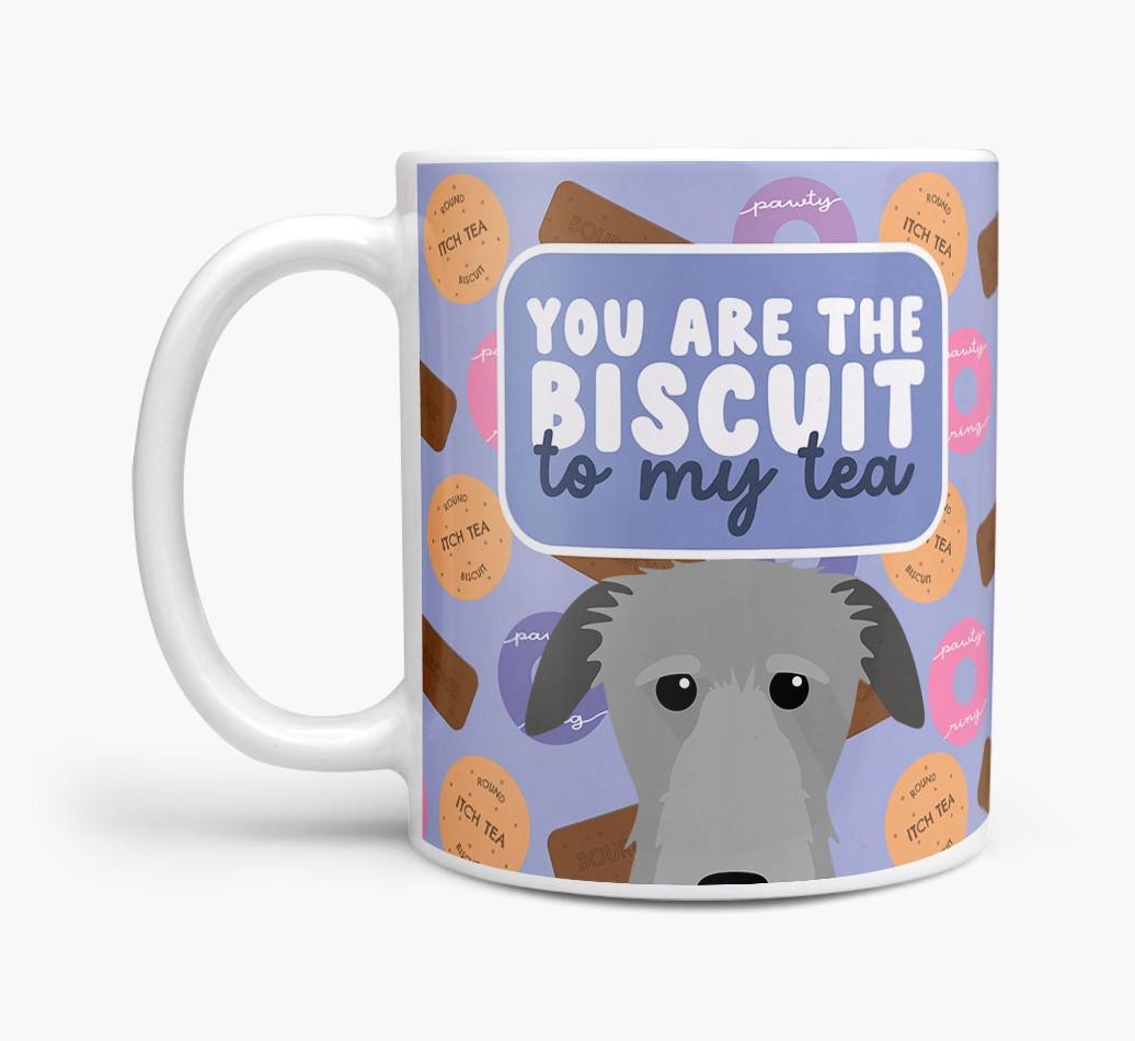 Featuring a cute biscuit motif paired with your Deerhound's adorable face, this mug is bound to be a firm favorite in every household.