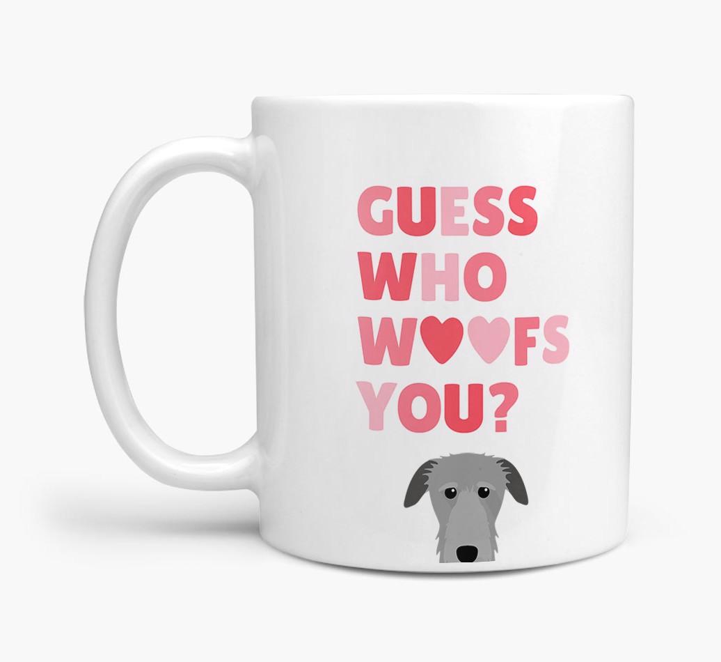 Personalized with Deerhound's cute face, this adorable mug is perfect for showing off the one who "woofs" you - how sweet!