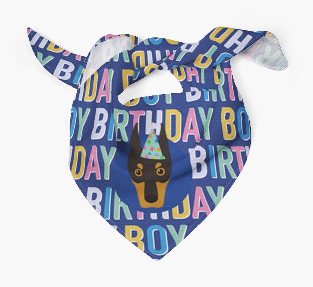 Featuring a colorful text pattern that reads 'birthay boy' and personalized with Dobermann's cute icon (complete with a fun party hat), your Dobermann will look simply pawgeous on their special day when they're wearing this bandana.