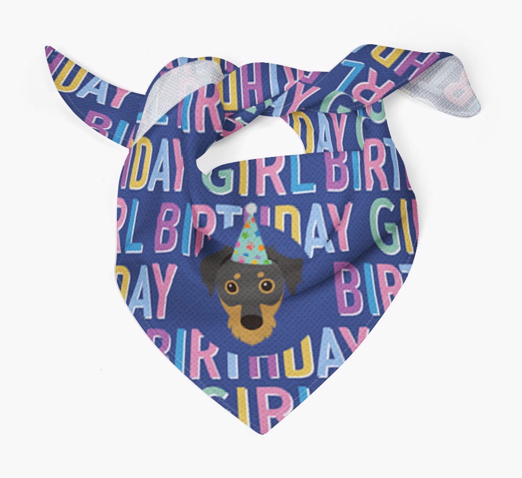 Featuring a text pattern that reads 'birthay girl' and personalized with Dorkie's cute icon (complete with a fun party hat), your Dorkie will look simply pawgeous on their special day when they're wearing this bandana.