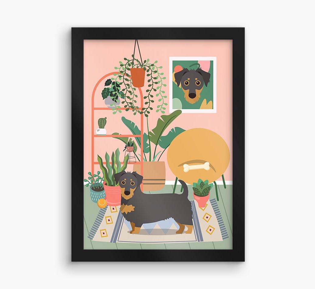 This contemporary piece of wall art pairs a chic living space with lovely pastel tones and a jungle of houseplants. Complete with the one that makes your house a home - Dorkie! - this print is a wonderful way to display your love for your pooch.