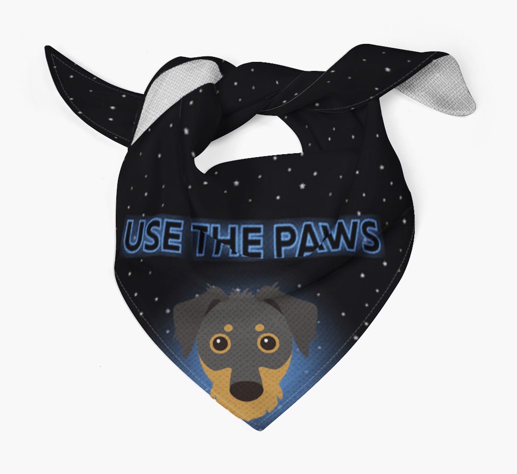 Featuring a starry night sky and glowing text, this bandana is made extra special with the addition of your Dorkie's cute icon.