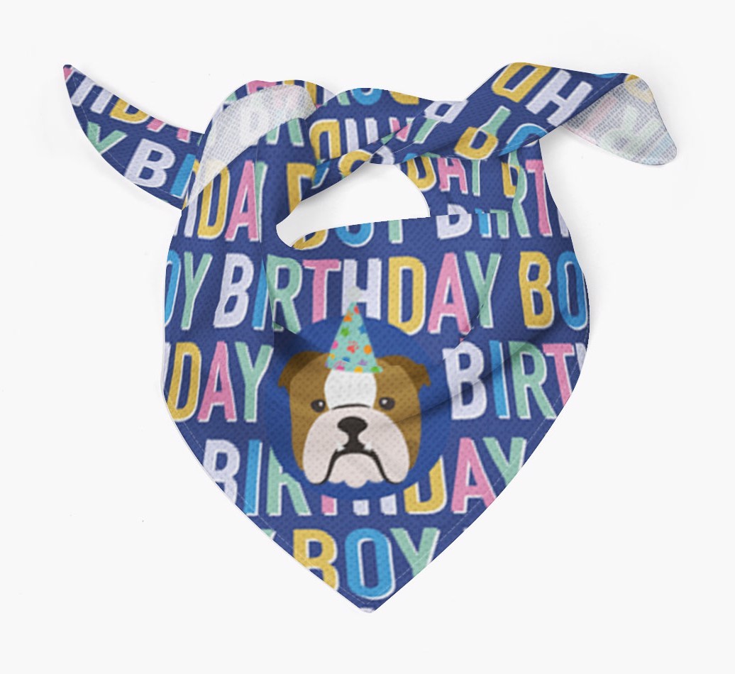 Featuring a colorful text pattern that reads 'birthay boy' and personalized with English Bulldog's cute icon (complete with a fun party hat), your Bulldog will look simply pawgeous on their special day when they're wearing this bandana.