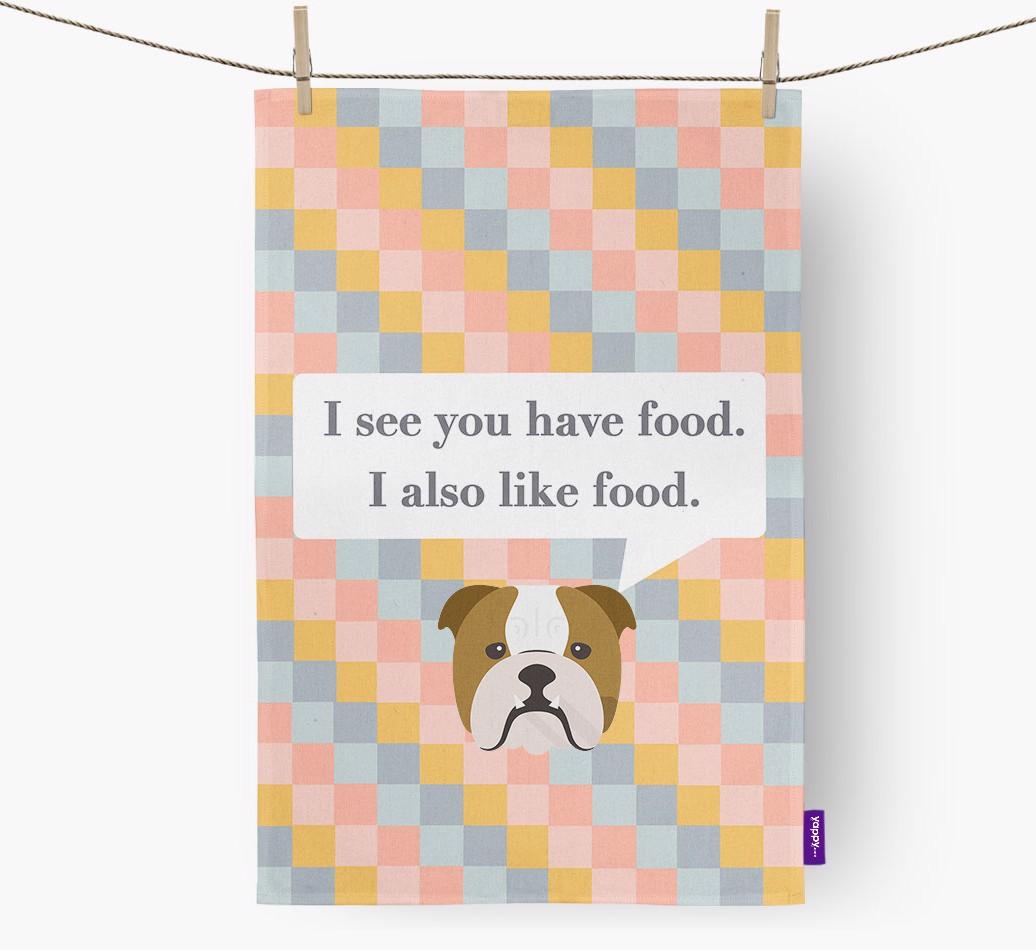If your English Bulldog is a full time snack machine, this dish towel may be the ideal way to warn your guests.