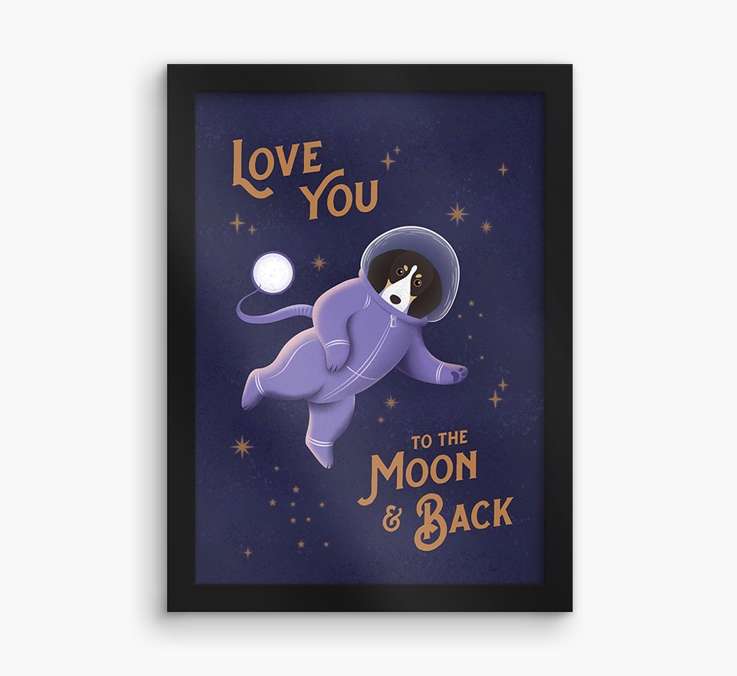 Starring your adventurous Coonhound dressed as an astronaut and printed with the words, 'love you to the moon & back', this artwork is a fun and unique way to put your four-legged friend on display and add canine charm to your home.
