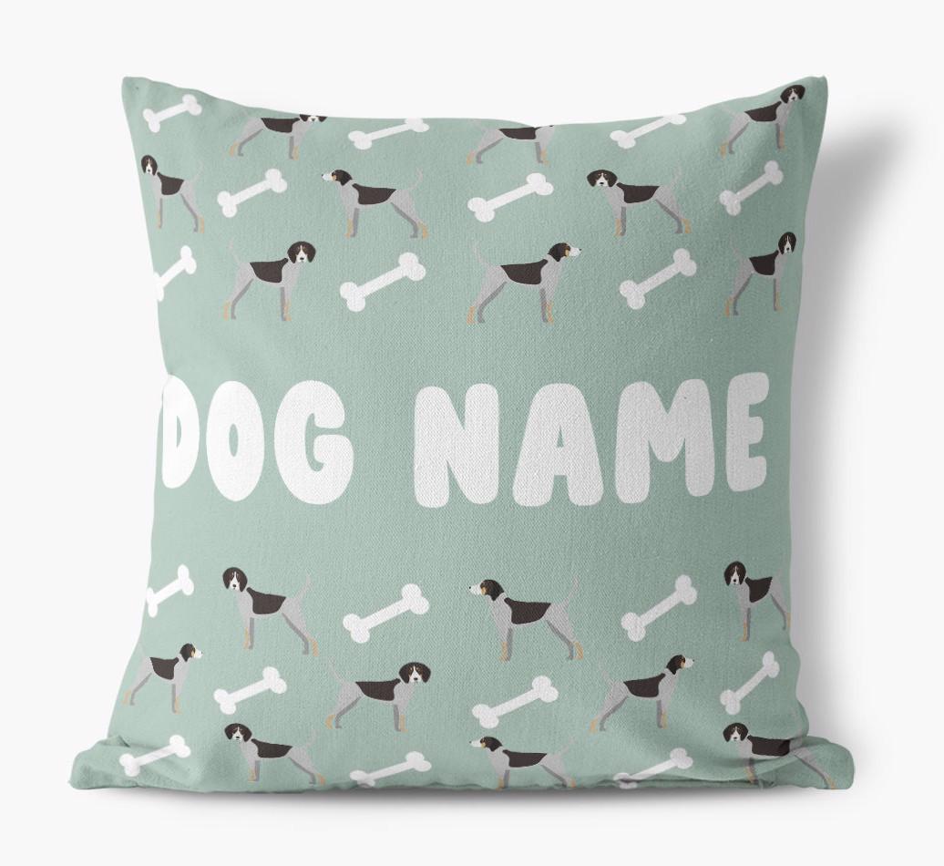 Personalized with English Coonhound’s name against a background of Coonhound icons and bones, this gorgeous pillow is full of pawsonality.