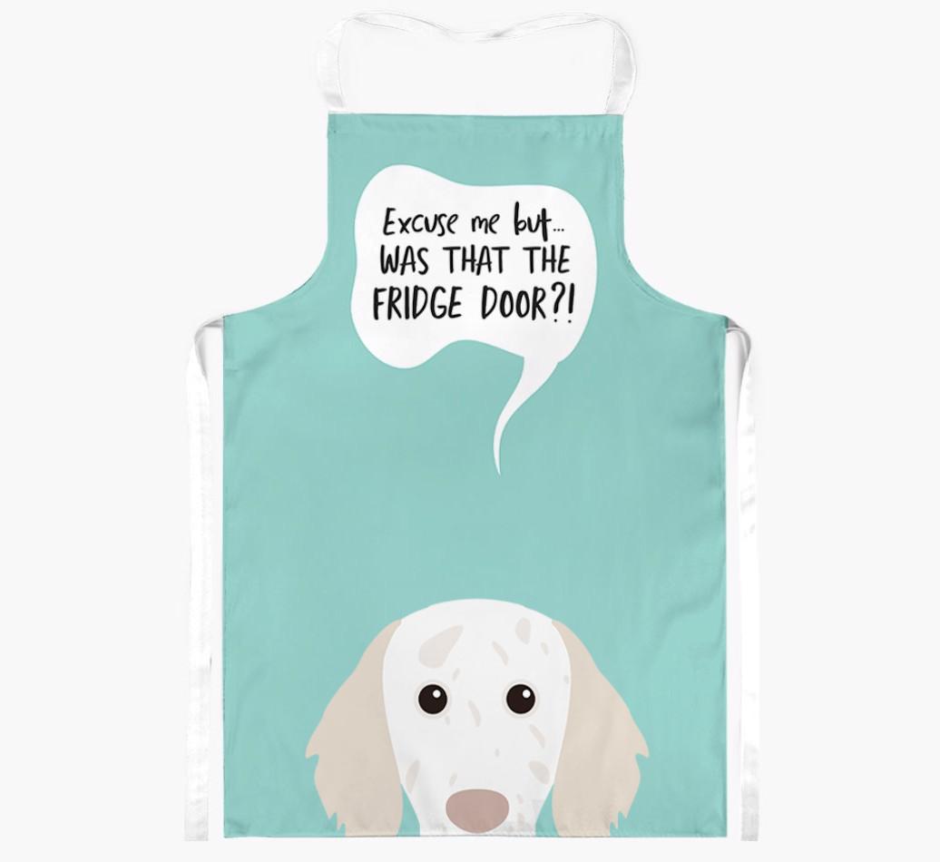 Featuring your hungry hound's cheeky icon and available in five eye-catching colors, this apron is a must-have for parents of greedy pups!