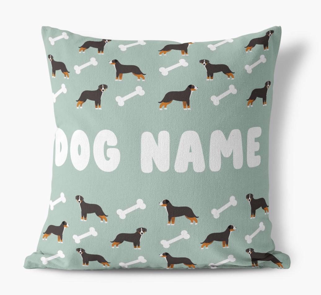 Personalized with Entlebucher Mountain Dog’s name against a background of Entlebucher icons and bones, this gorgeous pillow is full of pawsonality.