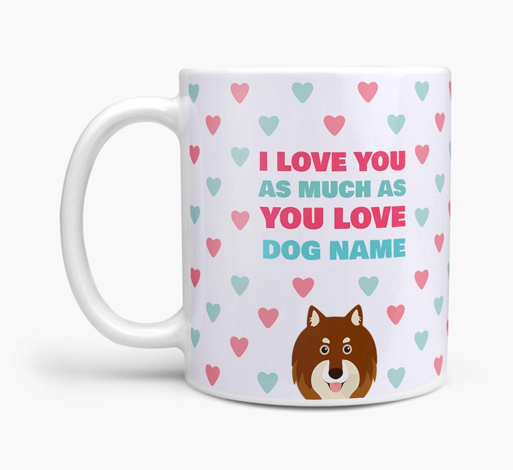 Featuring a pattern of hearts and personalized with Finnish Lapphund's name and their adorable icon, this mug is sure to make the receiver feel plenty of love and warmth towards you – and that’s not just from their coffee!