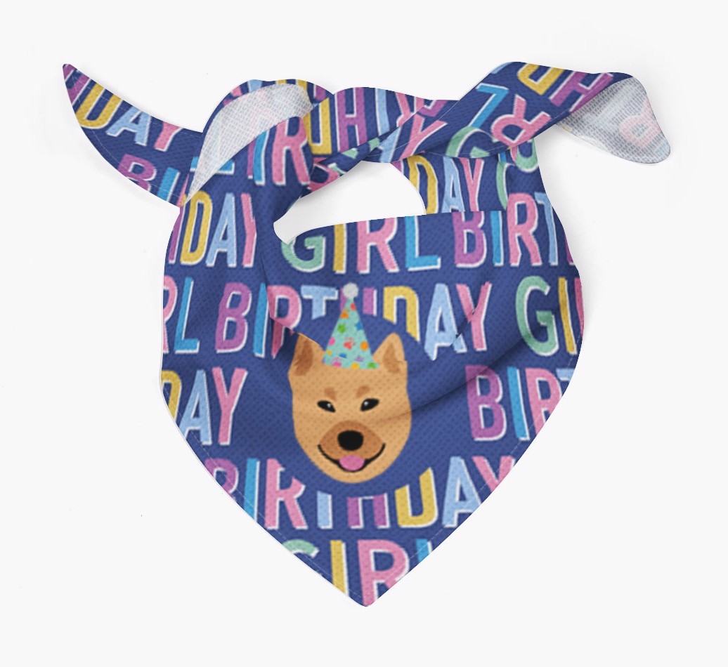 Featuring a text pattern that reads 'birthay girl' and personalized with Finnish Spitz's cute icon (complete with a fun party hat), your Finkie will look simply pawgeous on their special day when they're wearing this bandana.