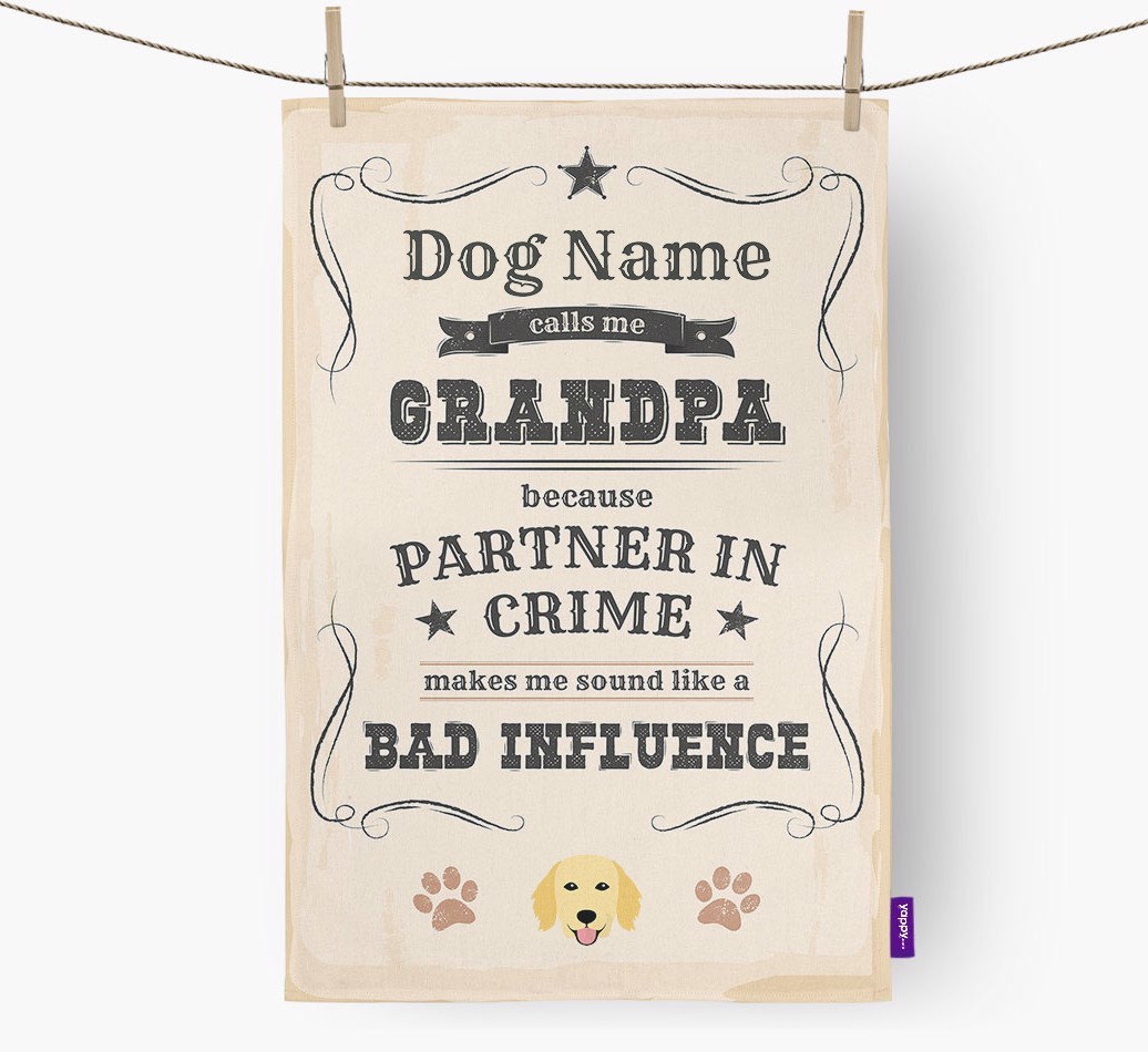 Are your grandpa and Your Flatcoat a mischievous pair when their together? Well, this dish towel will let all his guests know that Your Flatcoat and grandpa really are partners in crime (even if he doesn't want to admit it)!