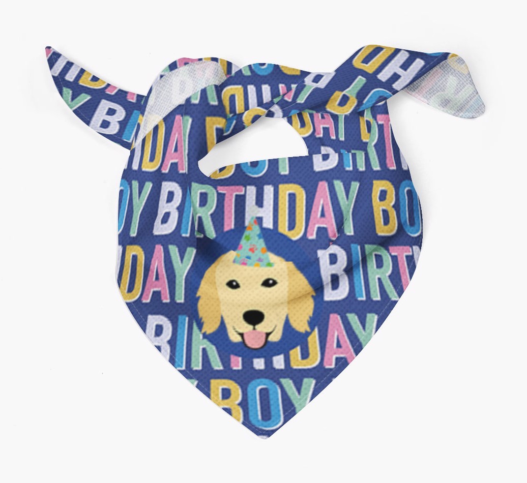 Featuring a colorful text pattern that reads 'birthay boy' and personalized with Flat-Coated Retriever's cute icon (complete with a fun party hat), your Flattie will look simply pawgeous on their special day when they're wearing this bandana.