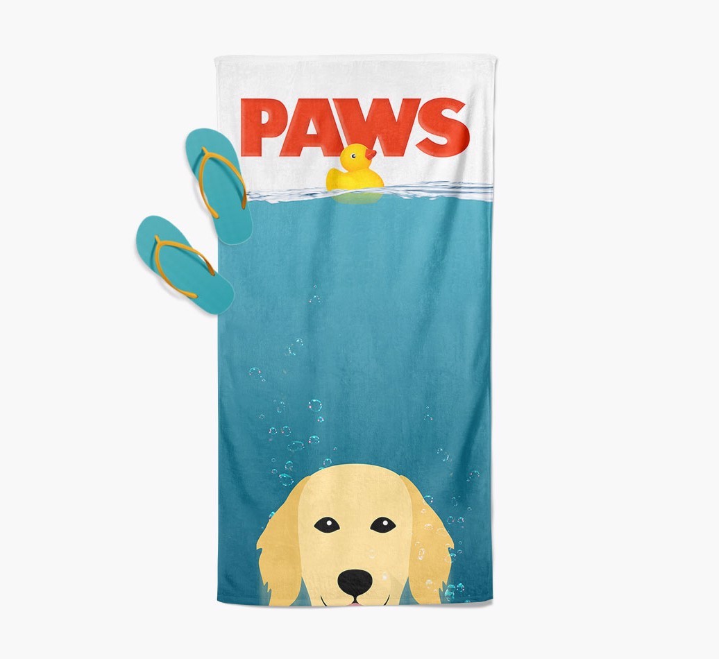 Featuring a design inspired by the blockbuster movie Paws, this colorful towel is personalized with Flat-Coated Retriever as the lead character to make this an extra special gift.