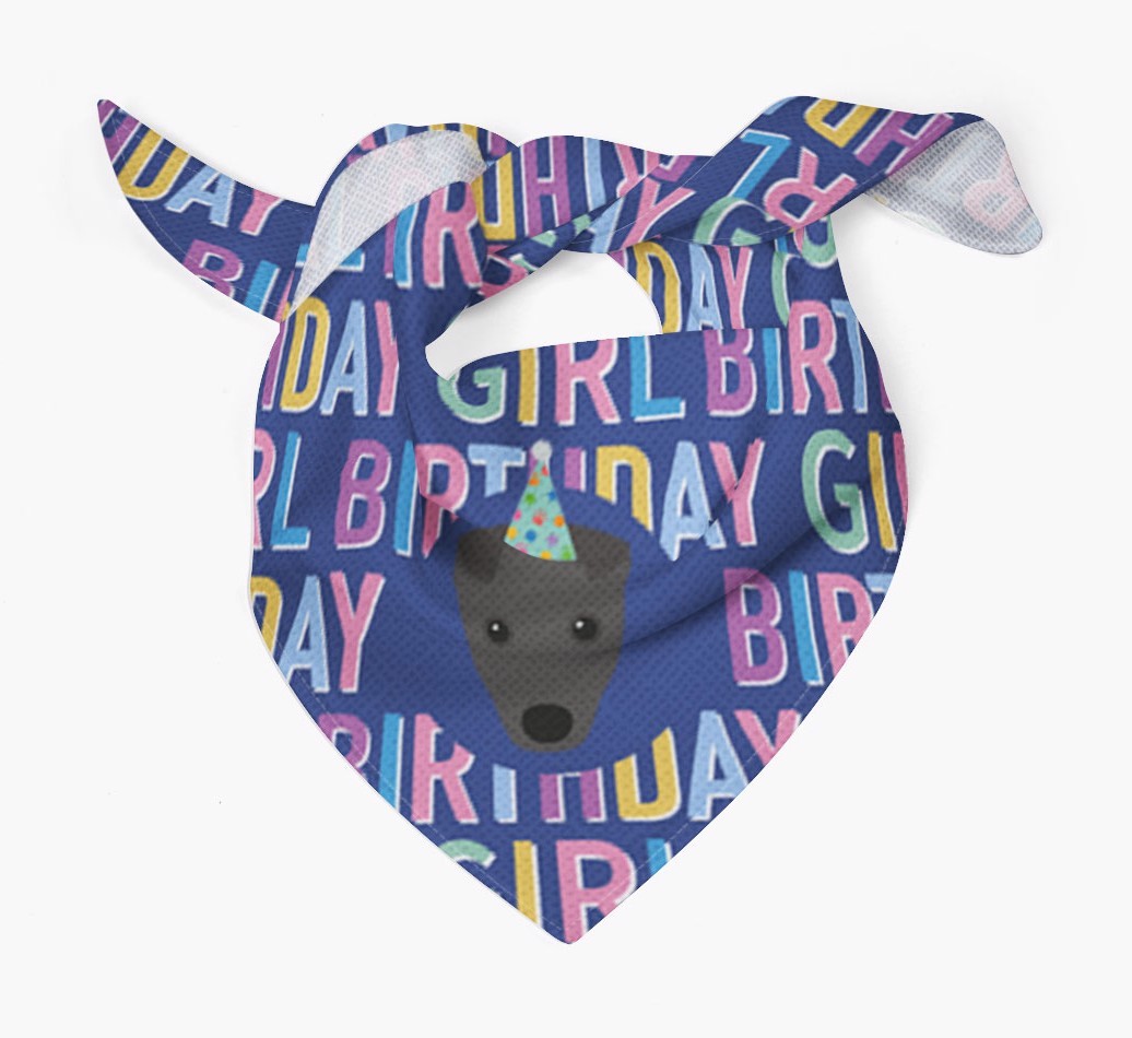Featuring a text pattern that reads 'birthay girl' and personalized with Fox Terrier's cute icon (complete with a fun party hat), your Fox Terrier will look simply pawgeous on their special day when they're wearing this bandana.