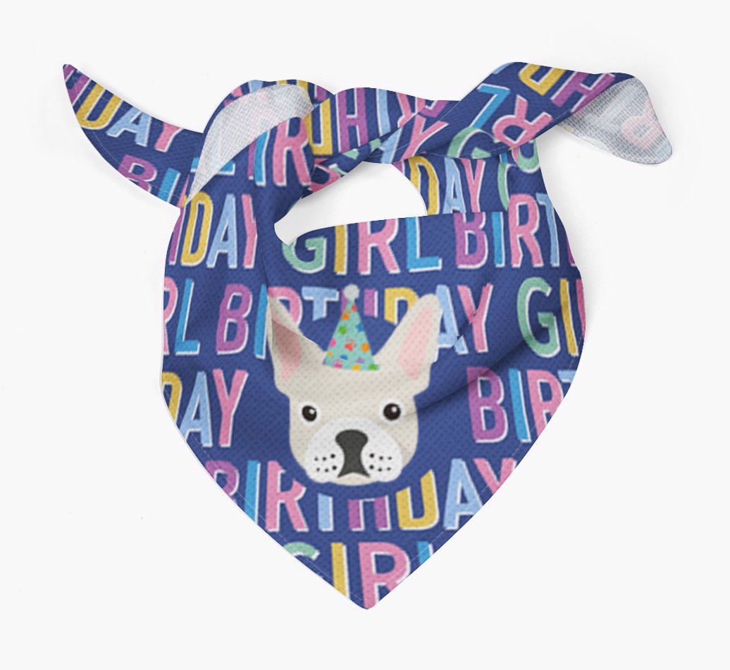 Featuring a text pattern that reads 'birthay girl' and personalized with French Bulldog's cute icon (complete with a fun party hat), your Frenchie will look simply pawgeous on their special day when they're wearing this bandana.