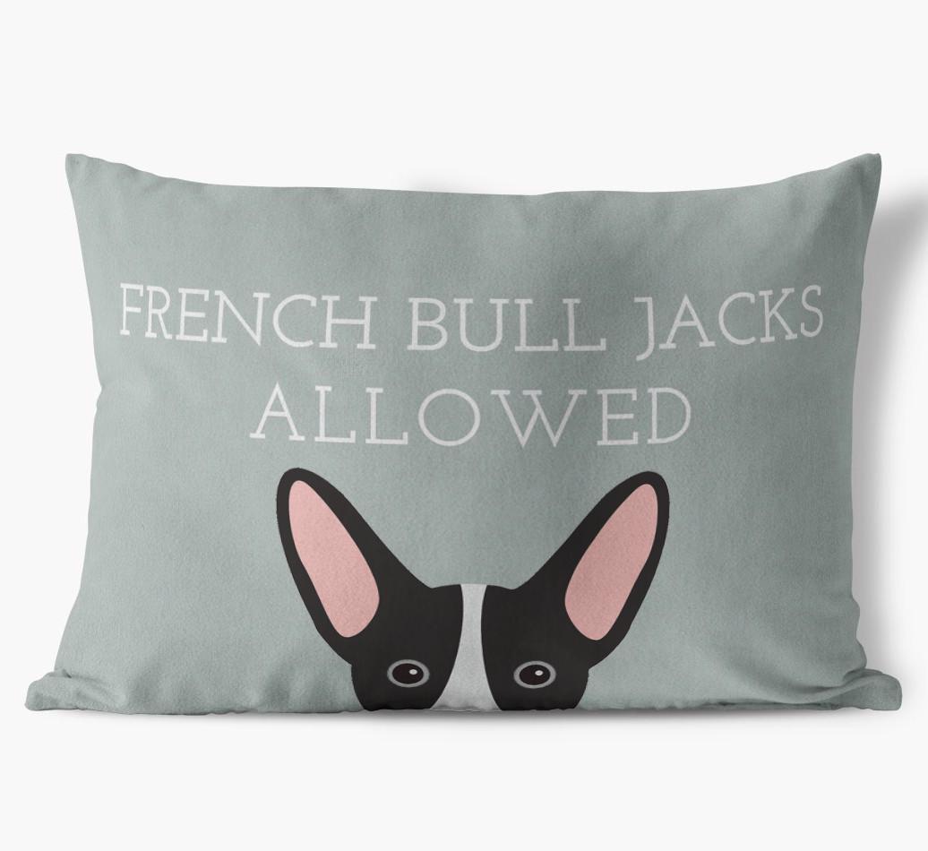 This exclusive, luxurious pillow is printed with the words ‘French Bull Jacks Allowed’, which I’m sure Your French Bull Jack would definitely approve of.