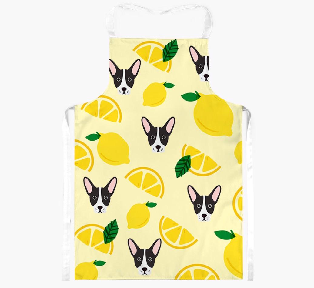 Fruity and fabulous, this apron is extra special as it features your French Bull Jack!