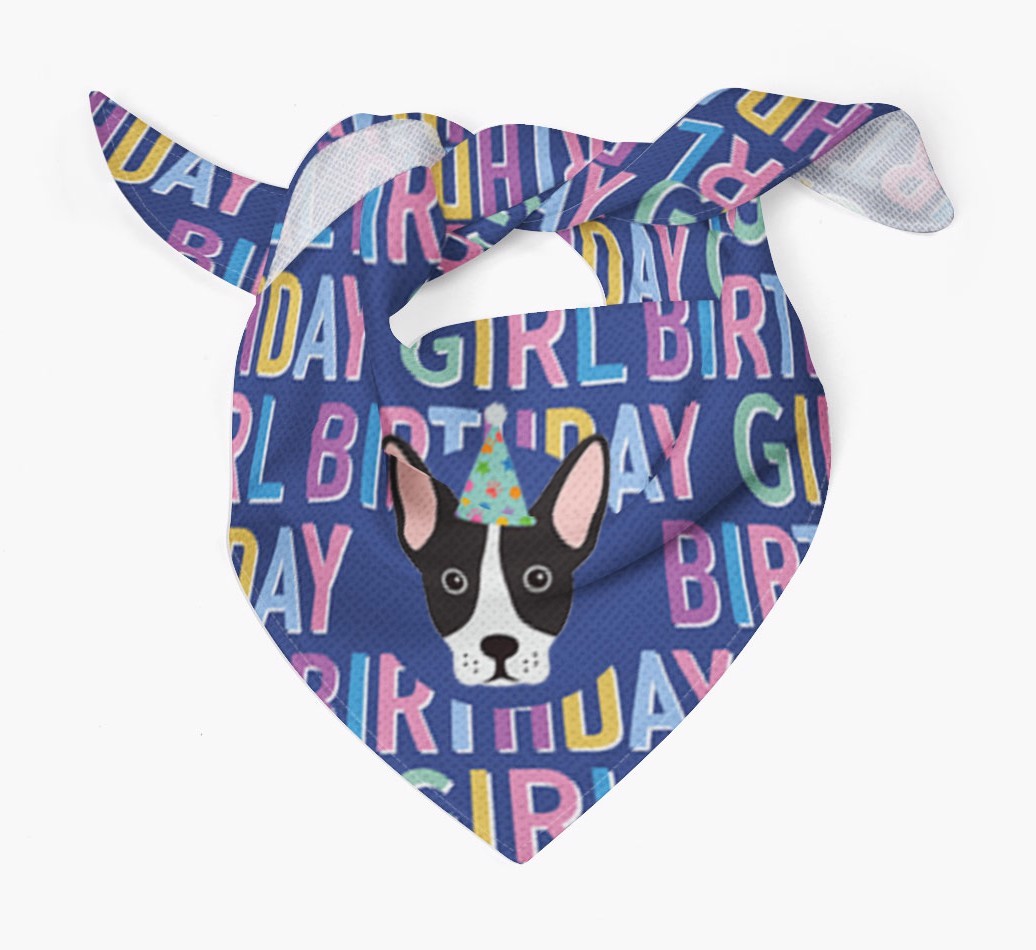 Featuring a text pattern that reads 'birthay girl' and personalized with French Bull Jack's cute icon (complete with a fun party hat), your French Jack will look simply pawgeous on their special day when they're wearing this bandana.