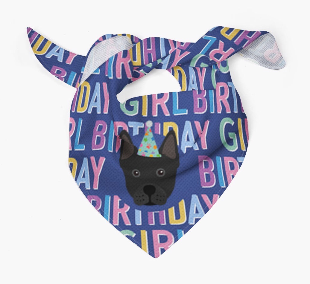 Featuring a text pattern that reads 'birthay girl' and personalized with Frenchie Staff's cute icon (complete with a fun party hat), your Frenchie Staff will look simply pawgeous on their special day when they're wearing this bandana.