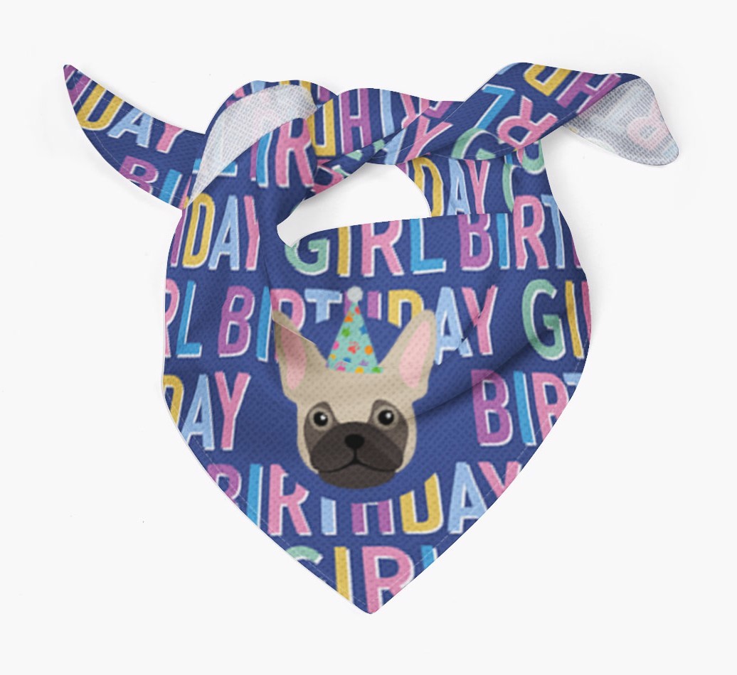 Featuring a text pattern that reads 'birthay girl' and personalized with Frug's cute icon (complete with a fun party hat), your Frug will look simply pawgeous on their special day when they're wearing this bandana.