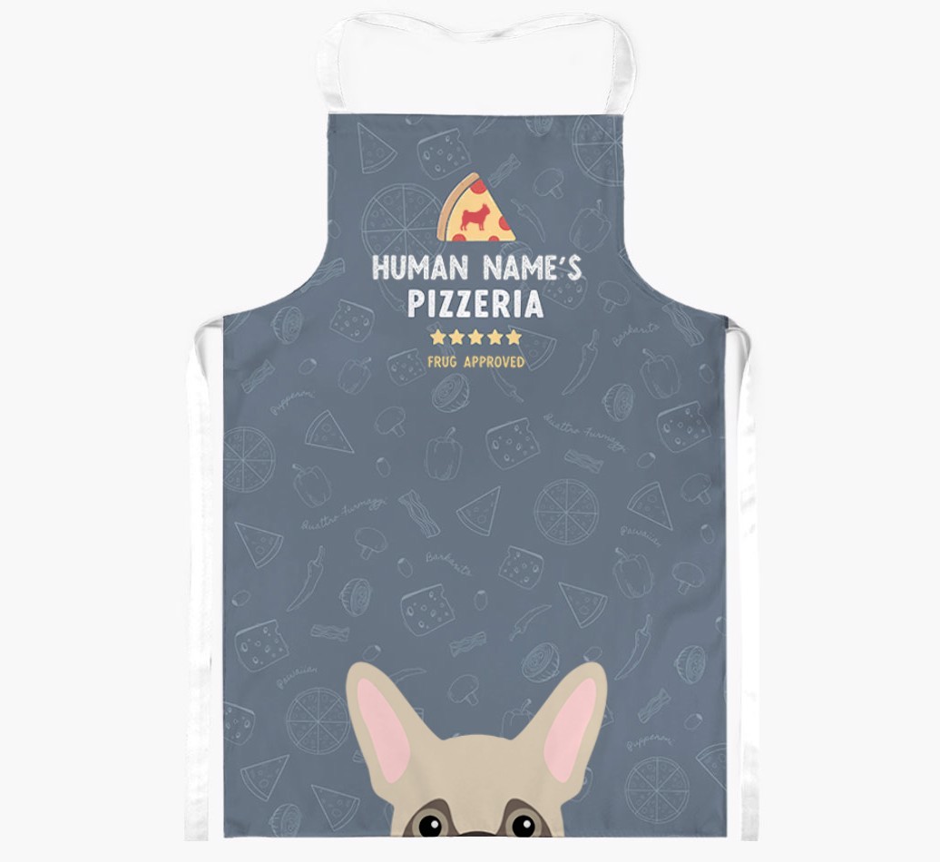 Featuring your furry friend's icon and lick of approval, plus your chosen human name, this apron is pawfect for anyone who considers themselves a pizza maestro in the kitchen. Available in a choice of 5 rustic colors, it'll make any Frug lover happy.