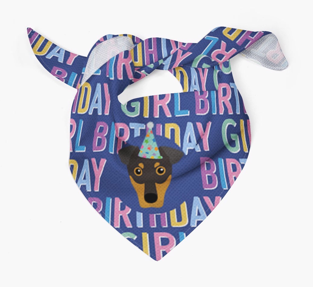 Featuring a text pattern that reads 'birthay girl' and personalized with German Pinscher's cute icon (complete with a fun party hat), your Pinscher will look simply pawgeous on their special day when they're wearing this bandana.