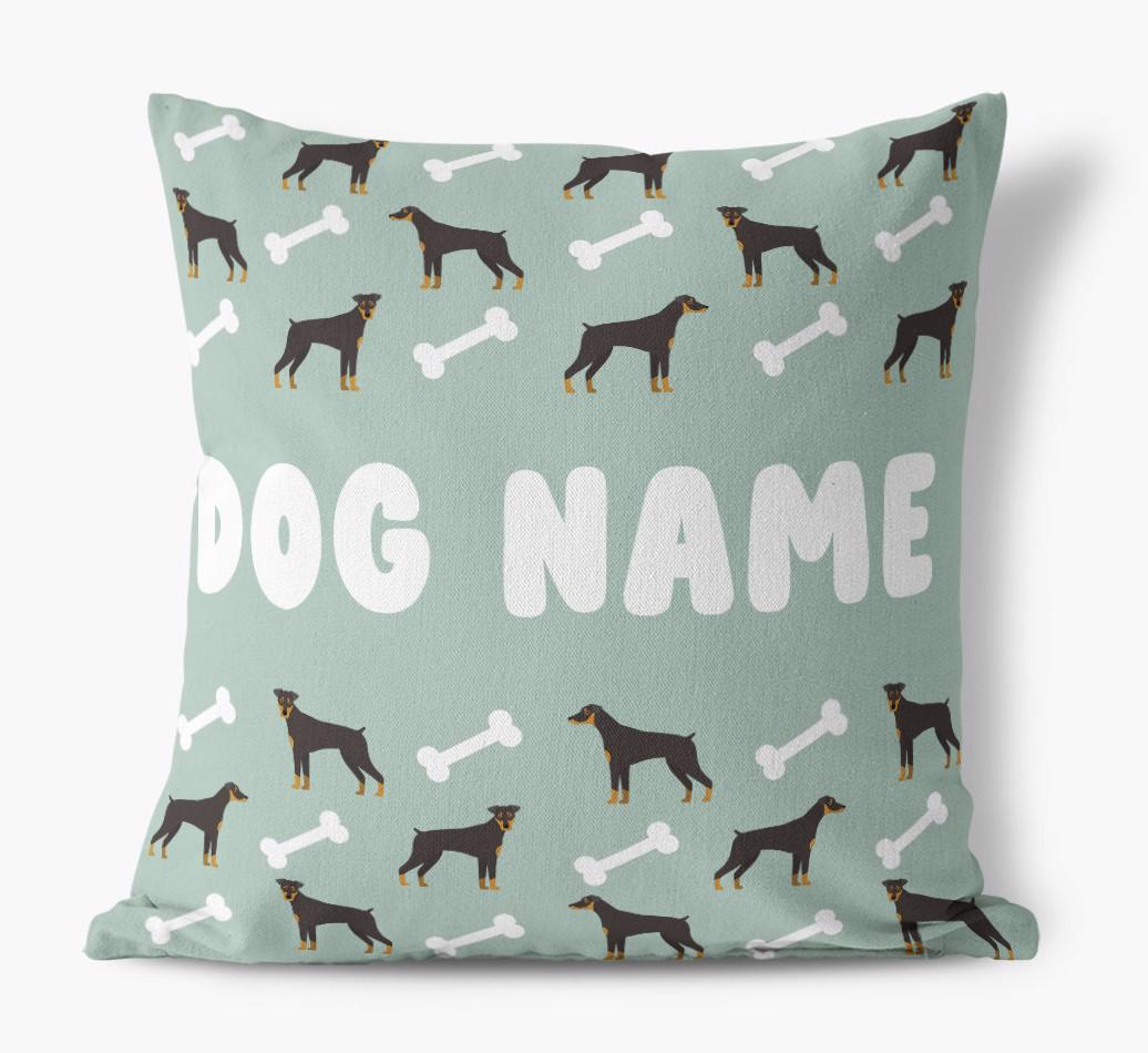 Personalized with German Pinscher’s name against a background of Pinscher icons and bones, this gorgeous pillow is full of pawsonality.