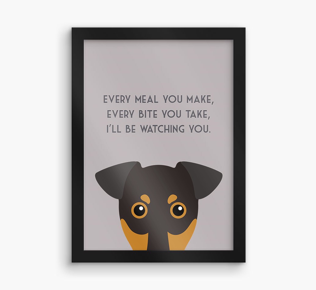 Printed with the words, ‘Every meal you make, every bite you take, I’ll be watching you’ and complete with our cute Pinscher peeking from the bottom of the design, this artwork will look great on display in the kitchen or anywhere German Pinscher likes to watch you eat!