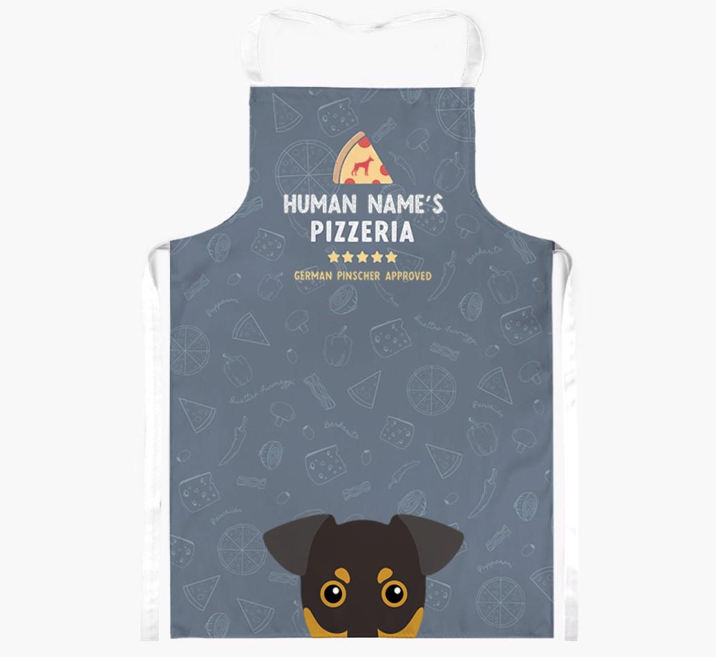 Featuring your furry friend's icon and lick of approval, plus your chosen human name, this apron is pawfect for anyone who considers themselves a pizza maestro in the kitchen. Available in a choice of 5 rustic colors, it'll make any Pinscher lover happy.