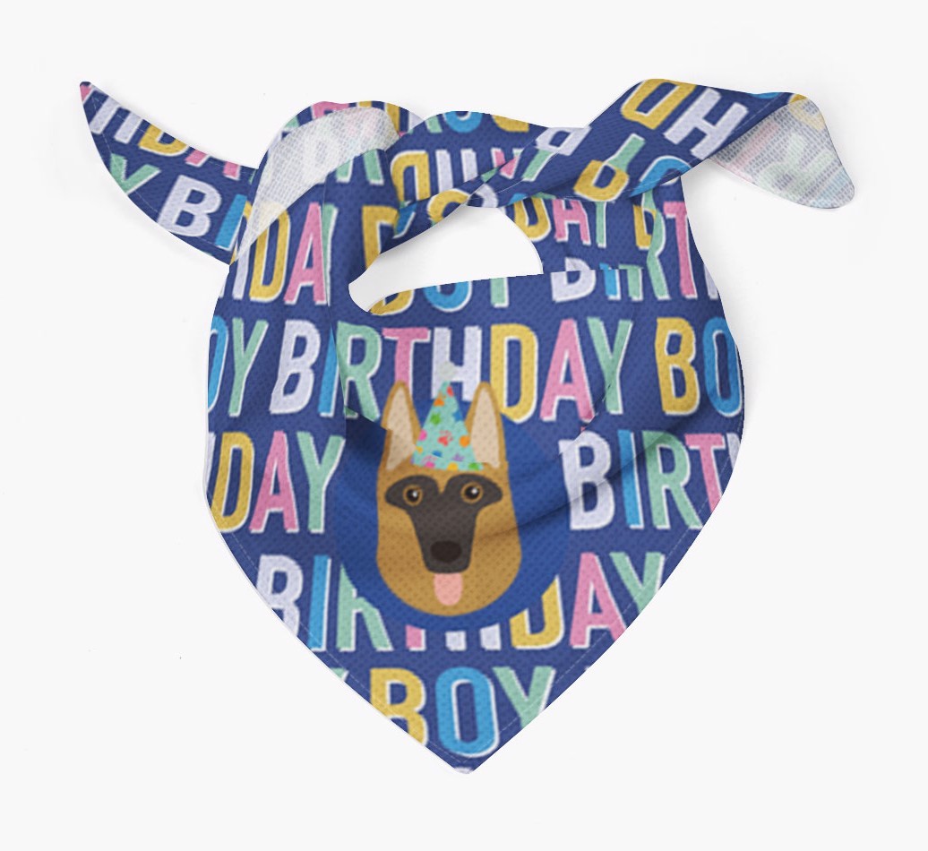 Featuring a colorful text pattern that reads 'birthay boy' and personalized with German Shepherd's cute icon (complete with a fun party hat), your German Shepherd will look simply pawgeous on their special day when they're wearing this bandana.