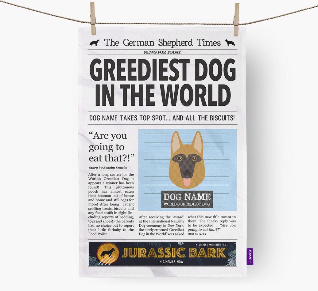 This unique dish towel puts German Shepherd truly in the spotlight (as if they weren’t already). It features a Yappy exclusive German Shepherd mug shot icon as well as two smaller German Shepherd silhouettes.