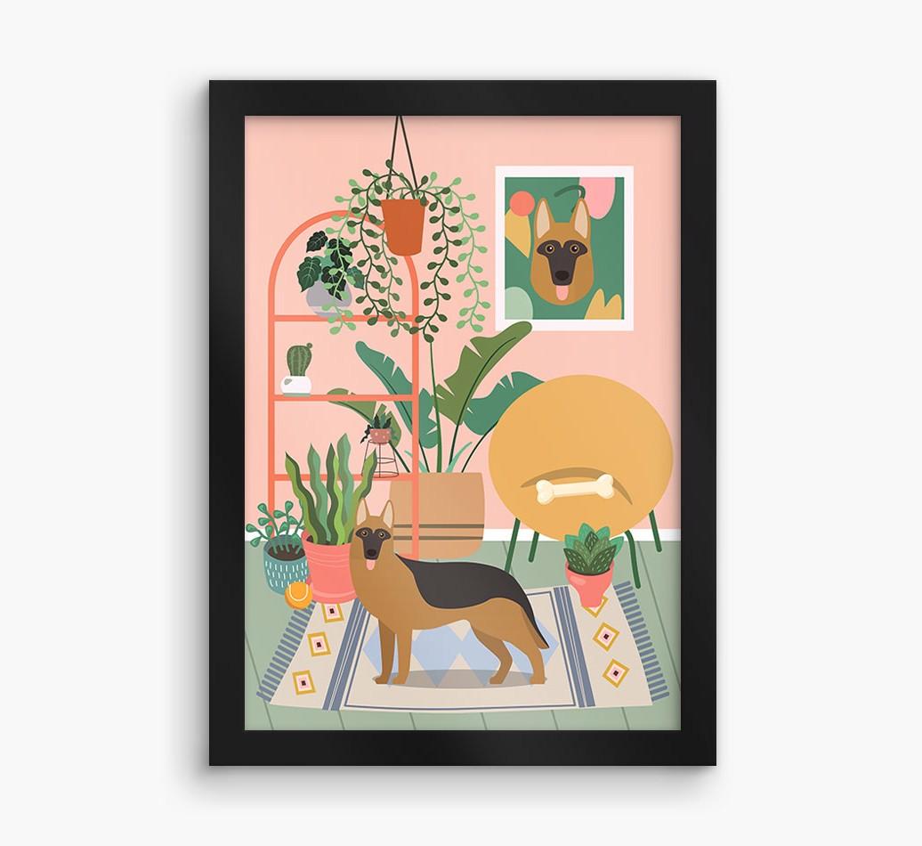This contemporary piece of wall art pairs a chic living space with lovely pastel tones and a jungle of houseplants. Complete with the one that makes your house a home - German Shepherd! - this print is a wonderful way to display your love for your pooch.