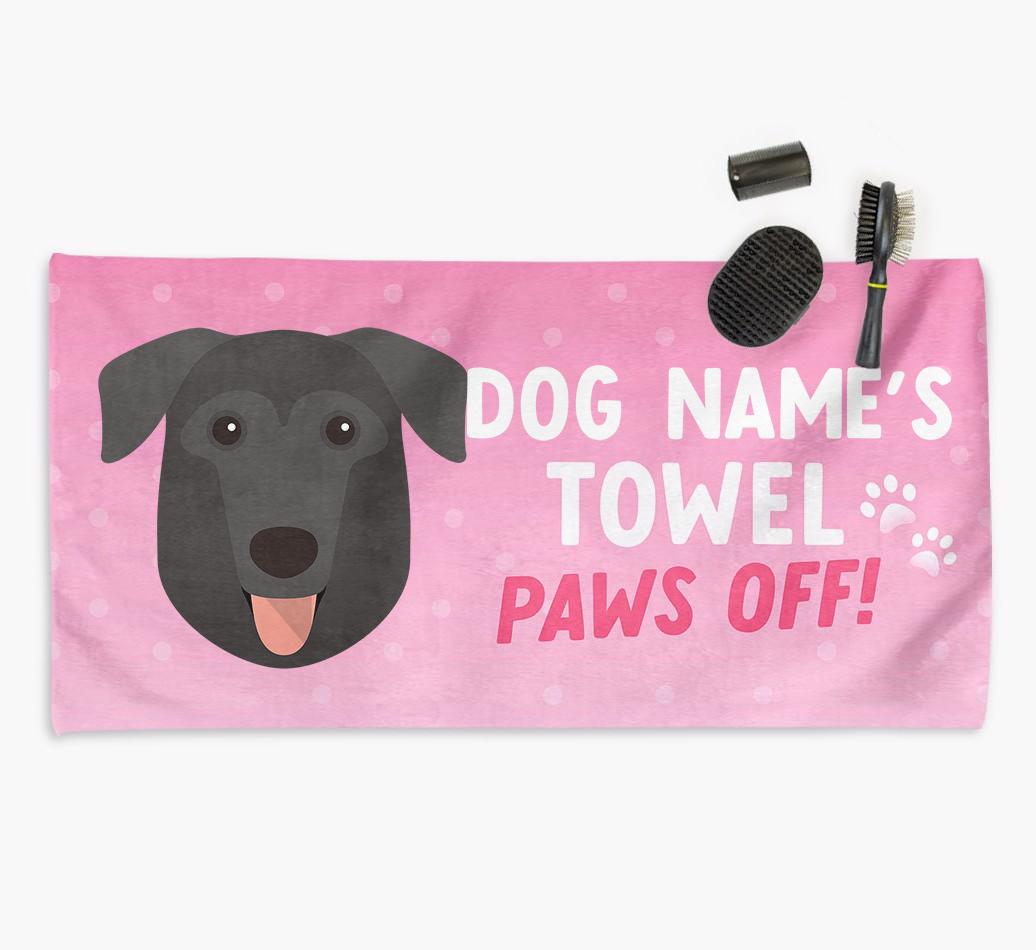 Perfect for messy pups and for pampering your Sheprador at bathtime, this soft and absorbent towel is made for cleaning your mucky pup and drying them off in a flash. It's personalized with German Sheprador's name and icon and is printed with a message for everyone else to keep their paws off it!