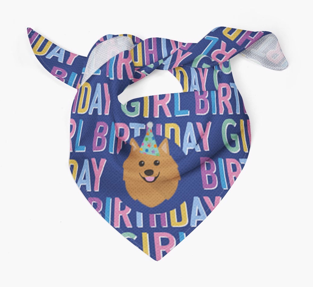 Featuring a text pattern that reads 'birthay girl' and personalized with German Spitz's cute icon (complete with a fun party hat), your Spitz will look simply pawgeous on their special day when they're wearing this bandana.