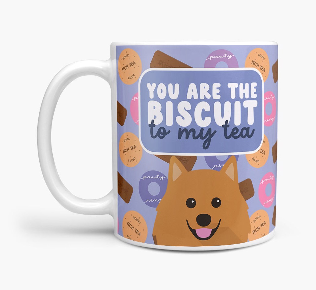 Featuring a cute biscuit motif paired with your Spitz's adorable face, this mug is bound to be a firm favorite in every household.